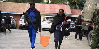 A police officer escorts a centre manager with examination papers at Michinda Boys Boarding and Day School in Elburgon, Nakuru County on October 30, 2023.