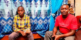 John Mwalili (left), who scored 64 points in the 2025 Kenya Junior School Education Assessment (KJSEA) results, with his father Nicholas Mwalili during an interview at their home in Kware, Nairobi on January 18, 2026.