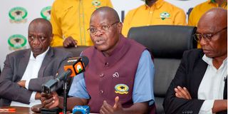 Kenya Union of Post-Primary Education Teachers (Kuppet) Secretary-General Akelo Misori addresses journalists on June 4, 2025, at the union’s headquarters in Nairobi, flanked by the National Treasurer Njenga Mwethi (left) and the National organizing secretary Paul Maingi.