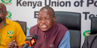 Kuppet Secretary-General Akelo Misori addresses journalists on June 4, 2025, at the union’s headquarters in Nairobi.
