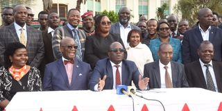 Moi University Council chairman, Prof Noah Midamba second (left), Dr Constantine Wasonga (centre), University Academy Staff Union secretary-general, Prof Kiplagat Kotut second (right), vice-chancellor of Moi University, Dr Grace Nyongesa, the union's chairperson, Dr Busolo Wegesa (right), the union's Moi University Chapter Chairperson, and other officials during a press conference at the institution on September 09, 2025.