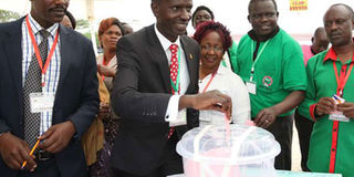 Knut Secretary-General Wilson Sossion casts his vote on March, 4, 2016 during the union's elections at Safaricom indoor arena. Mr Sossion said the government must be ready to invest in teachers so that public learning can deliver quality education and have motivated teaches. PHOTO | JEFF ANGOTE | NATION MEDIA GROUP
