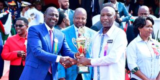 President William Ruto hands over a trophy for best University stand to the Vice-Chancellor of Kenyatta University Prof Paul Wainaina at the 2025 Nairobi International Trade Fair.