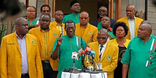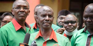 Former Knut Secretary-General Wilson Sossion (centre) with other union leaders address journalists after a past meeting in Nakuru.