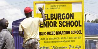 A man re-writes a school’s signpost in Elburgon town, Nakuru County on May 31, 2025. Most secondary school signposts are changed and redesigned ahead of Grade 9 learners’ transition to senior schools in January 2026..