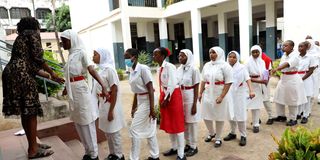 Supervisers frisk Candidates at Coast Girls Secondary School in Mombasa before kicking off their First Written Examination Paper during this years Kenya Certificate Of Secondary Education (KCSE) Exams in this photo taken on November 4, 2024.