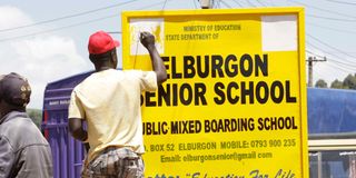 A man re-writes a school signpost in Elburgon town, Nakuru County on May 31, 2025. Most secondary school signposts are being changed and redesigned ahead of Grade 9 learners’ transition to senior school in January 2026.