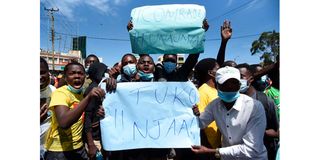 Moi University students demonstrate in the streets of Eldoret over delays to release Helb funds on March 10, 2021.