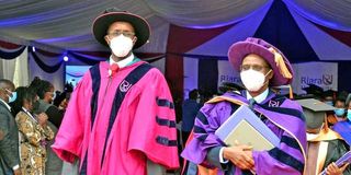 Riara University Chancellor Dr Wilfred Kiboro (right) and vice-chancellor, Prof Robert Gateru, during the institution's graduation ceremony in Nairobi on July 9, 2021.