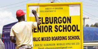 A man re-writes a school signpost in Elburgon town, Nakuru County on May 31, 2025.