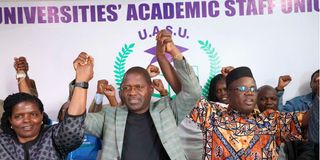Universities Academic Staff Union National Chairperson Dr Grace Nyongesa (left) with Secretary General Dr Constantine Wasonga (right) and Kenya University Staff Union Secretary-General Charles Mukhwaya after addressing the media at their Head office in Nairobi on October 31,2025.