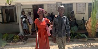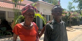 Visually impaired mother Stella Kadzo,52, and her son Teddy Kahindi, 18, at the Shimo La Tewa Boys Senior School seeking placement. The mother went to secure her son's slot in the senior school due to a lack of school fees.