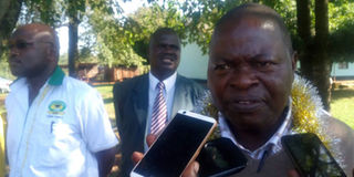 Kuppet National Secretary-General Akelo Misori speaks to journalists at Chulaimbo Secondary School on June 27, 2017 with his Kisumu County counterpart Zablon Awange (left) and Homa Bay County’s Stephen Yogo . PHOTOS | JUSTUS OCHIENG’ | NATION MEDIA GROUP