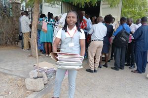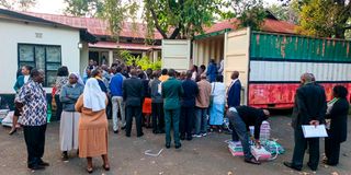 Kakamega County Deputy Commissioner Christine Chacha distributes KJSEA and KPSEA exam papers to centre managers of comprehensive primary schools for Kakamega Central at the container outside the Kakamega County Commissioner's office on October 27, 2025.