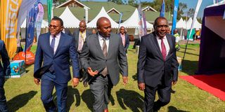 Principal Secretary of Kenya State Department for Energy Alex Kamau Wachira (Centre) Kenya Electricity Generating Company PLC (KenGen) Chairman Board of Directors Alfred Agoi Masadia (Right) and Managing Director & CEO Peter Njenga (Left) during the Sustainable Energy Conference at Olkaria, Naivasha, Nakuru County, on September 17, 2025.