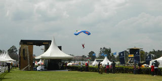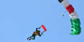 A Kenya Defence Forces soldier in a parachute show at the showground on August 27, 2015.