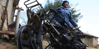 A police officer stands next to the burnt shell of a motorbike at Kiganjo Police Station. The bike was set alight by a mob who accused its rider of stabbing another rider to death at the Kiganjo trading centre in Nyeri County, on August 16, 2016.