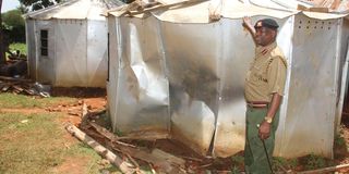 Nandi Central Administration Police Commander Benson Maina inspects houses which were torched by boda-boda riders at Kamomo police post on September 15, 2015. The riders killed a suspected motorcycles thief.