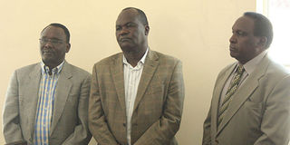 From left: Former State House official Joshua Kulei with former Commissioner of Lands Wilson Gachanja and former Kenya Airports Authority boss Peter Kipyegon Lagat in court. PHOTO | FILE | NATION MEDIA GROUP