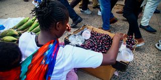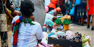 Sylvia Teresa, a street vendor at Nairobi's busy Moi Avenue sells fruits with her baby tied to her chest on March 11, 2025. The 22-year-old delivered her baby through C-section but was back on the streets when the baby turned three months.