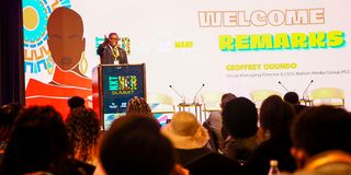 Nation Media Group, Group Managing Director and CEO Geoffrey Odundo gives his remarks at the NXT HER Summit at Movenpick Hotel, Nairobi, themed “Breaking Barriers – 30 Years On” on August 21, 2025.