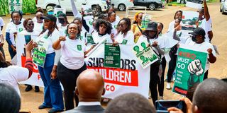 Some alumnae of Alliance Girls High School stage a protest outside the school in Kikuyu, over alleged sexual harassment of students by a male teacher, on July 10, 2025.