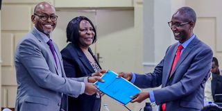 Technical Working Group on GBV including Femicide Chairperson Dr Nancy Baraza and Vice-Chair Dr Sam Thenya receive a report from National Crime Research Centre CEO Dr Mutuma Ruteere (right) during the stakeholders’ engagement held at KICC on April 9, 2025.
