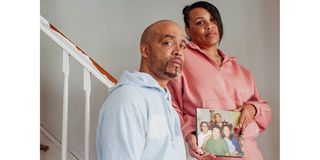 Kennith Cunningham (left) and Travias Cunningham-Case hold a photograph of themselves pictured with their sister Telichia Cunningham-Morris and their mother Mary Cunningham, who is one of thousands of people suing hair relaxer manufacturers in the US.