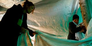 Alawite women prepare a makeshift tent in the grounds of the Hmeimim Air Base, in Latakia. At least 33 Alawite women and girls have vanished in Syria since Assad's fall, with families receiving ransom demands up to £80,000.