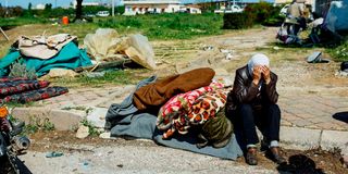An Alawite woman sits with her belongings in the grounds of the Hmeimim Air Base, in Latakia, western Syria. Eight children under 18 are among the missing as Alawite families keep daughters at home, fearing they'll be next.