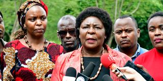 The Technical Working Group on Gender-Based Violence, Including Femicide chairperson, Dr Nancy Baraza (centre), briefs the media after the conclusion of a public participation session at Moi Girls Secondary School on May 28, 2025.