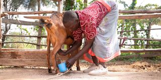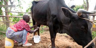 Beatrice Wairimu milk her cow at her home in Miyogo, Laikipia East, on July 2, 2025. Beatrice is a widow living with disability and shoulders the burden of unpaid care work, including domestic chores.