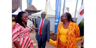 Phyllis Wakiaga (left) with her predecessor Betty Maina (right) the Industrialization, Trade and Enterprise Development CS during the 1st edition of the Meat Expo and Conference at the KICC on November 19, 2021. Looking on is Johnson Weru, the PS Trade and Enterprise Development.