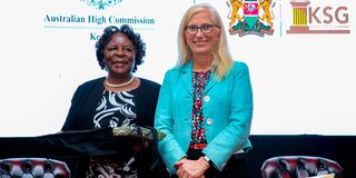 Australian High Commissioner Jenny Da Rin (right) with the Presidential Technical Working Group on GBV adviser, Dr Nancy Baraza, during a public dialogue to mark International Women’s Day at the Kenya School of Government in Lower Kabete on March 4, 2026.