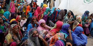Women displaced because of the floods wait to receive food handouts while taking refuge in a camp, in Sehwan, September 30, 2022.