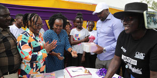 Homa Bay County Gender Executive Committee Member Elijah Munga (second right) joins Zana Africa Executive Director Beatrice Jane (third right), Public Health Chief Officer Everlyne Ododa and Homa Bay County Health Director Addel Ottoman (second left) during the launch of a study aimed at understanding the challenges women face during their menstrual cycle, at Otaro Primary School in Rachuonyo North, Homa Bay County, on December 10, 2025.