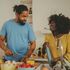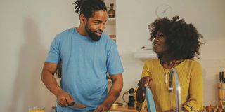 A cheerful couple in their kitchen at home. The man is chopping vegetables and cooking dinner as his wife washes dishes.