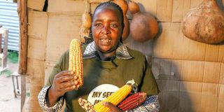 Belakom Organic Farmers chairperson Beatrice Wangui displays a variety of maize species at her home in Langalanga, Gilgil Sub-county, Nakuru County.