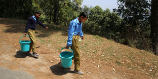 Schoolchildren (Gaurav Bohra and Sujal Kumar, both in 8th standard) fetch water buckets while returning from school near Sal village of Champawat district.