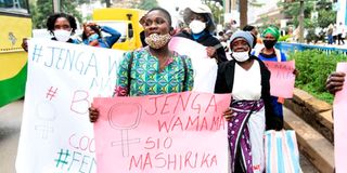 Women working in informal sector demonstrate on Kenyatta Avenue, Nairobi last year. They demanded for Covid-19 stimulus packages for women from the Government. Globally, more women have been adversely affected by the pandemic.