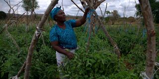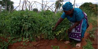 Jennifer tends to her tomatoes in her farm in this picture taken on July 3, 2025. She is one of the known farmers in Kitui-South which is predominantly a dry area.
