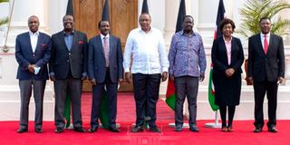 President Uhuru Kenyatta during a meeting with political party leaders at State House, Nairobi. Present at the presser are party leaders; Gideon Moi (KANU), Musalia Mudavadi (ANC), Kalonzo Musyoka (WIPER), Raila Odinga (ODM), Charity Ngilu (NARC) and Mosses Wetangula (FORD Kenya).
