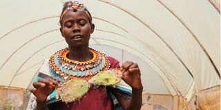 Eunice Kaparo, a member of Twala Cultural Village in Laikipia North Sub-county, holds cactus leaves colonised by predator insects. She has also set up a biogas plant at her homestead.