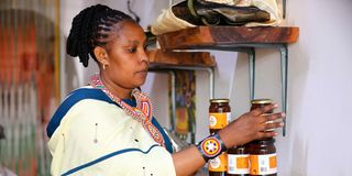 Rosemary Mosiany, an apiculture farmer specialising in organic honey, arranges packaged honey at her shop in Nanyuki town on February 26, 2026. She harvests one-and-a-half tonnes of honey every season, and makes and sells beekeeping equipment.