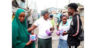 Harrison Ochieng' (right) distributing pads to (from left) Zaiyun Abdul, Hellen Nduku and Janet Kanini in Mukuru Kwa Njenga, Nairobi.