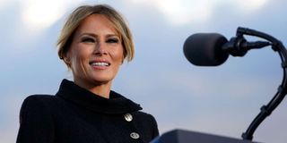 US First Lady Melania Trump speaks before boarding Air Force One at Joint Base Andrews in Maryland on January 20, 2021.