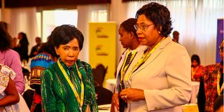 Prof Maria Nzomo (left) interacts with former Gender CS Prof Margaret Kobia during the NXT HER Summit at Mövenpick Hotel, Nairobi, on August 21, 2025.