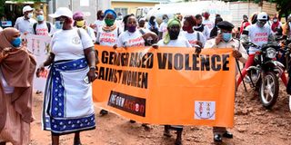 Activists and members of civil societies mark the 16 Days of Activism against Gender-based Violence in Isiolo town last year. Male anti-SGBV champions have called on men to recognise women's rights.