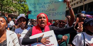 Hundreds of protesters march through the streets of Nairobi during an anti-femicide demonstration on December 10, 2024, demanding action against increasing violence against women.