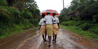 Girls walk home from school in a countryside village of Sierra Leone on July 11, 2019.